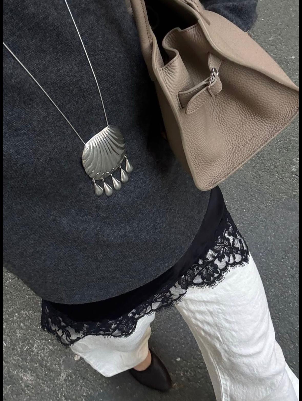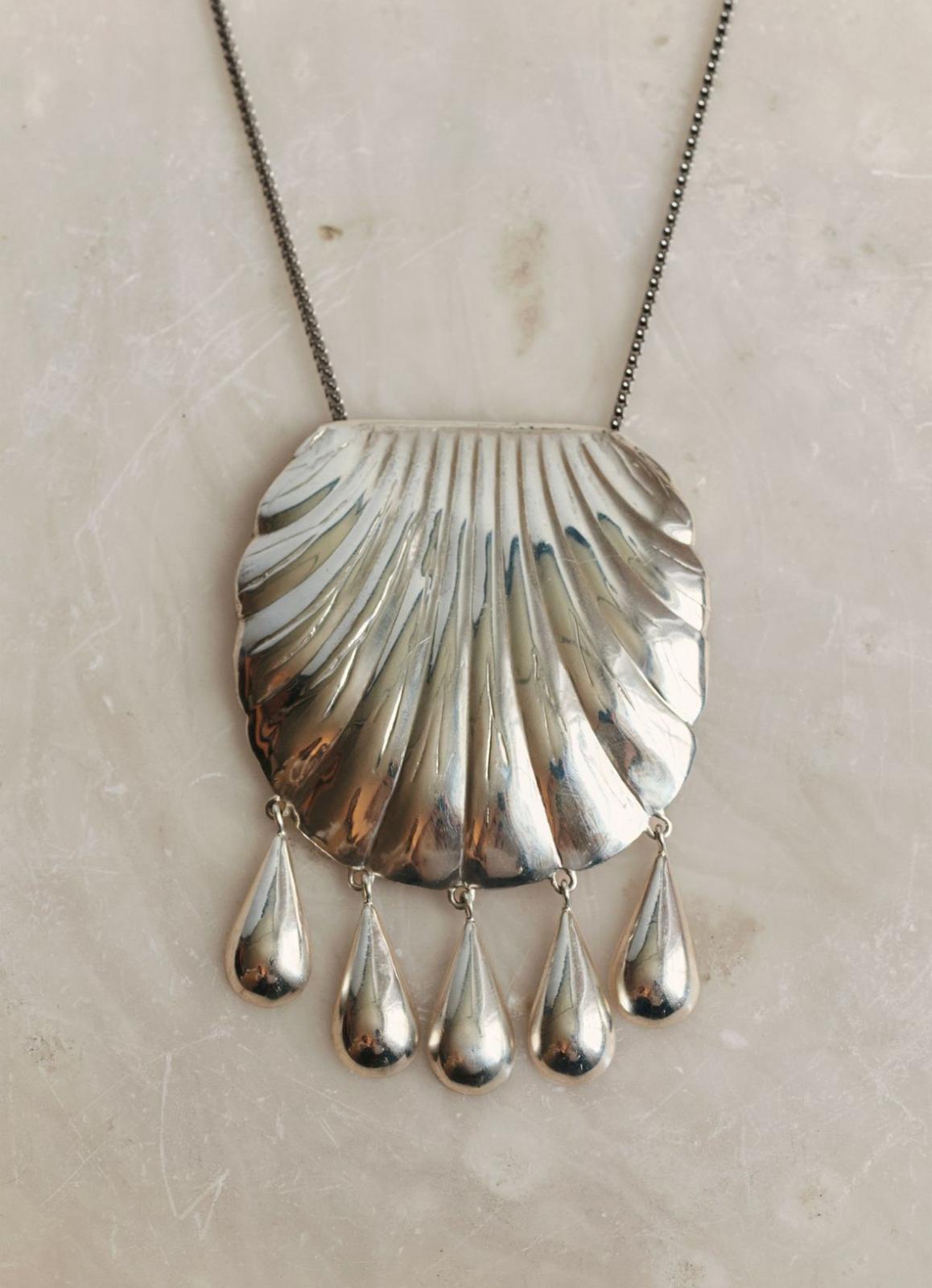 Diese moderne Halskette überzeugt durch ihr einzigartiges Design aus metallischen Muschelelementen und einem stilvollen Tropfenanhänger. Die schwere, hochwertige Verarbeitung sorgt für eine edle Optik, während der schlichte Metallton vielseitig kombinierbar bleibt. Die feine Politur und die liebevollen Details verleihen der Kette eine besondere, künstlerische Ausstrahlung. Ideal für Alltag, besondere Anlässe oder als dekoratives Statement-Piece.